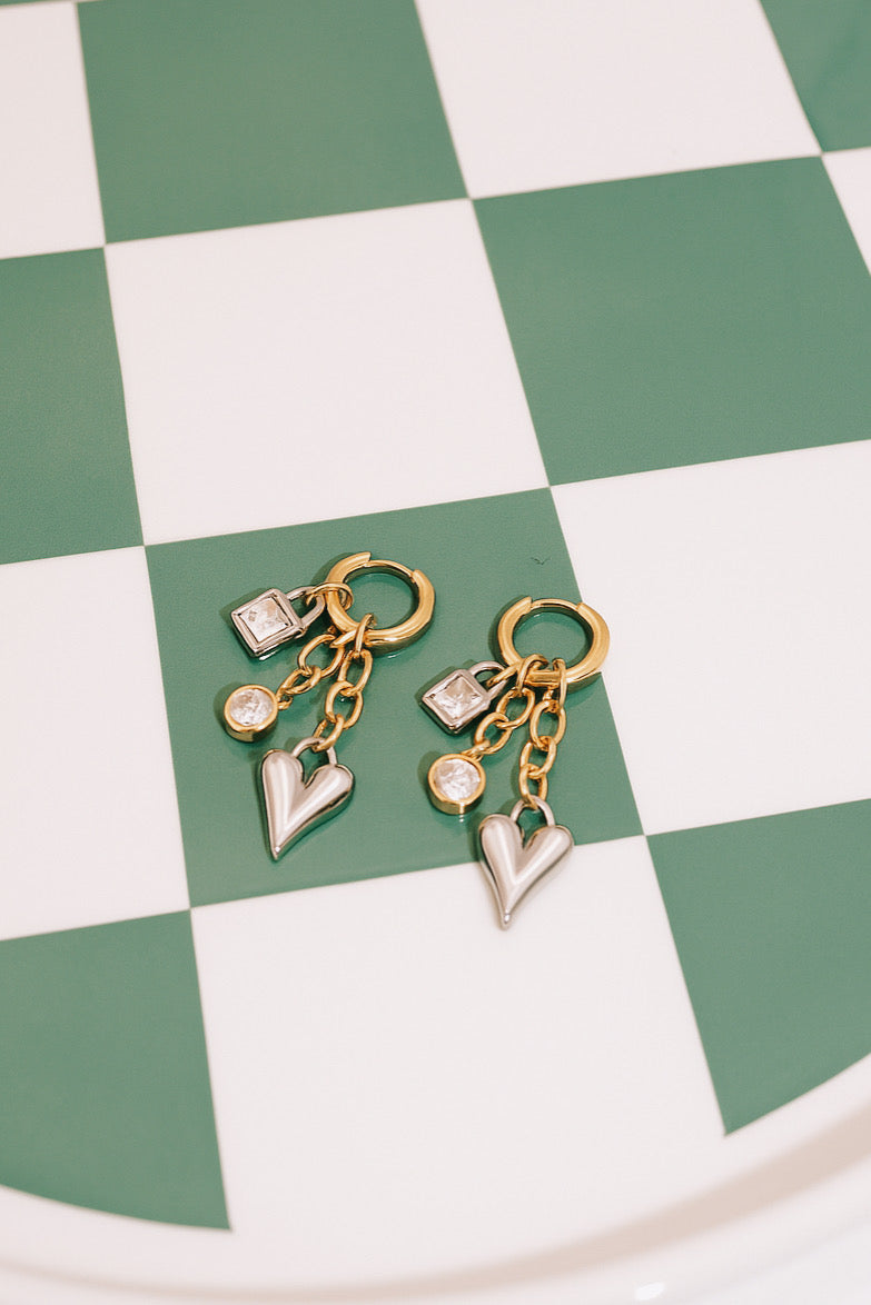 Verleihe deinem Look ein kühnes, verspieltes und zugleich bedeutungsvolles Statement mit diesen modischenDangle-Creolen, die eine goldfarbene Kette mit drei einzigartigen Bi-Color-Anhängern kombinieren.